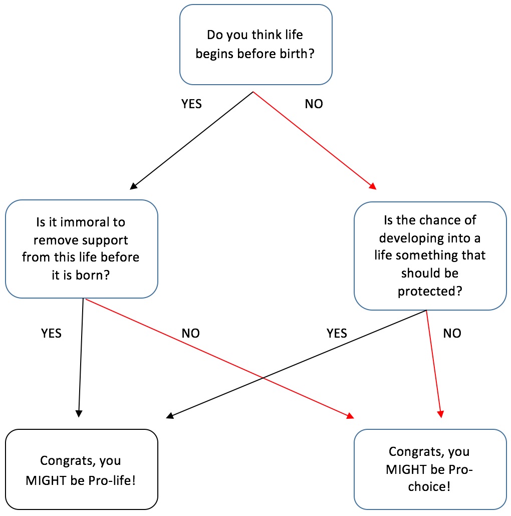 These arguments, presented simply in this flowchart, only scrape the surface of the complex issue of abortion. They all have their own rebuttals and counter-rebuttals, and they don’t even begin to address utilitarian arguments or exceptions for rape, incest, or the mother’s life. However, by presenting some of the complexities, I believe I have illustrated the complexity of issues to be considered before being able to justifiably claim oneself as “Pro-choice” or “Pro-life”