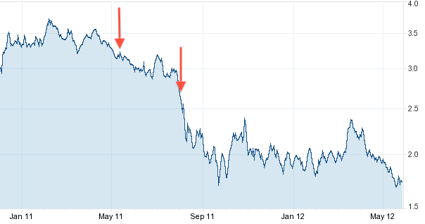 Interest rates are supposed to rise since there is less confidence that the US will repay its debts. The first arrow roughly marks the beginning of last year’s debt debate, and the second arrow roughly marks the end of it. Not only did interest rates drop over the doubtful period, but they continued to plummet after the deal and the downgrade, and are now touching record lows.