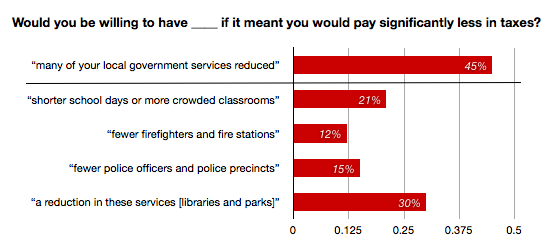 In a new CBS/NYT poll, 45% of respondents were willing to have many local government services reduced if it meant lower taxes, but it was a lot harder to fill that “many” with specifics: