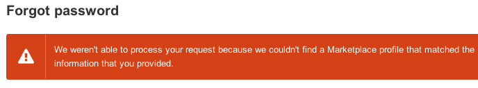 What?? Couldn’t find a profile? With the information I provided? You mean with the information you provided me from your own Marketplace?? I tried again three separate times over the next few days, at different times of day and from different browsers and operating systems. Each time I got an email, and each time the link in the email sent me to the error above. I even tried replacing the period in the username in the URL with its URI encoded value in case they weren’t escaping strings properly.